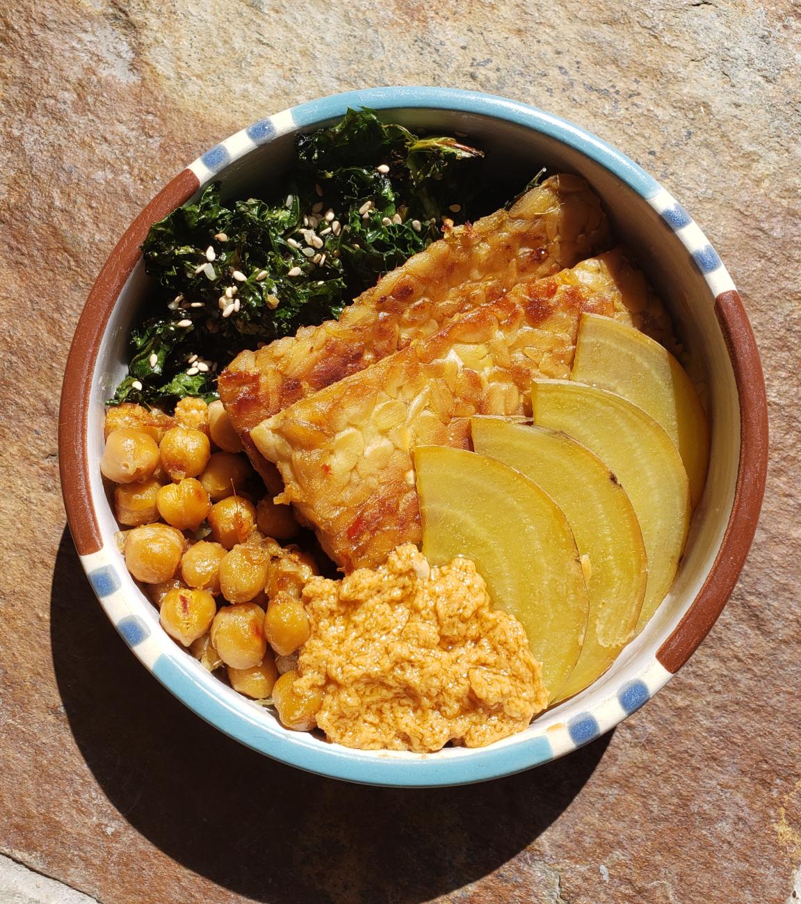 This recipe has several different (and easy) parts, but if you get confused about the steps, I will include a short explanation below. I cook the rice and beets at the same time because it takes about the same time for the water to boil in two pots and for the rice and beets to cook. The kale goes in the oven after I start the rice and beets and I leave it in for about 20 min to add a little crunch to the bowl. Then I cook the chickpeas and tempeh. Then I make the sauce. Et voila!