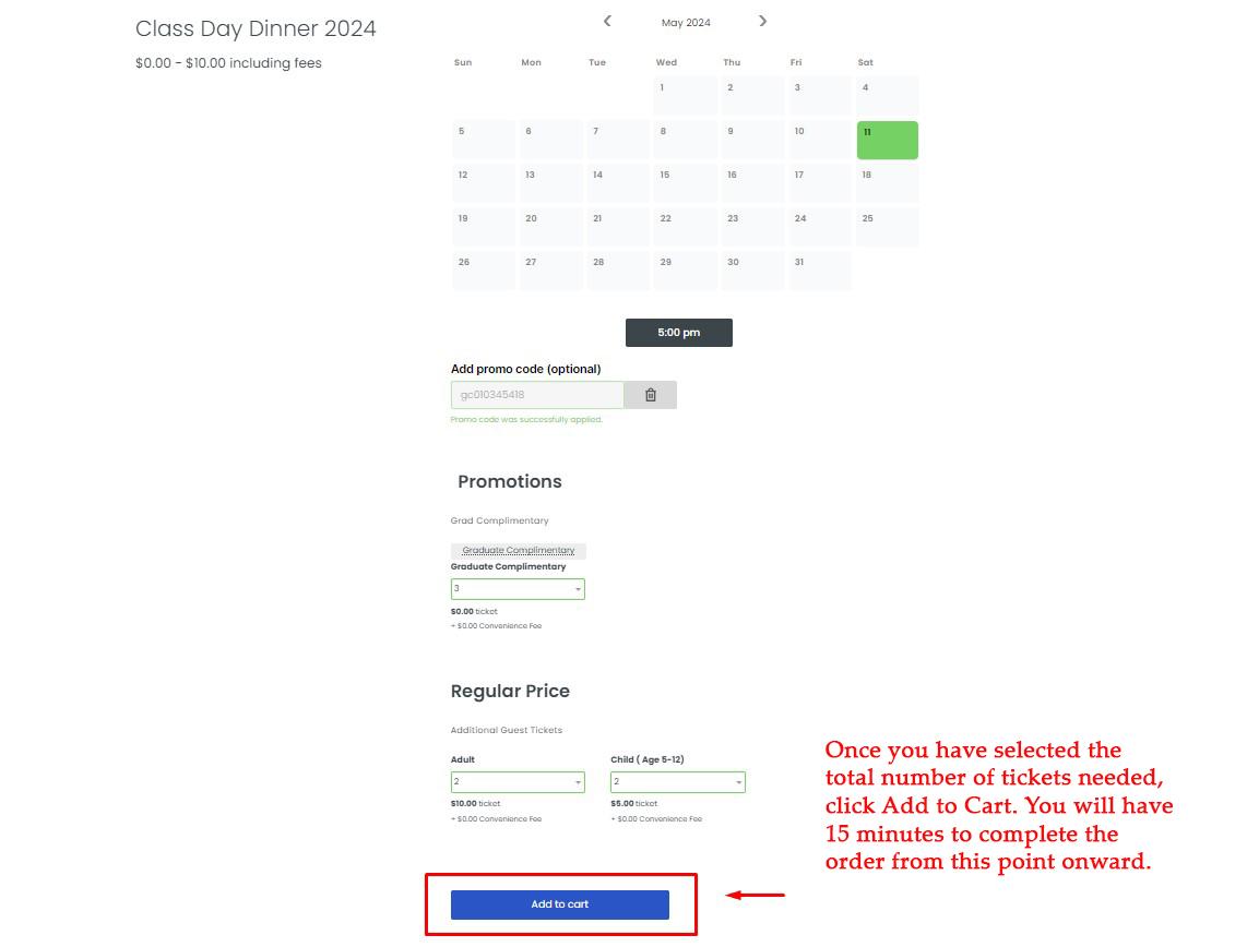 A new field with a dropdown selector will open under Promotions. This is where you will claim the three complimentary tickets each student is allowed. Located below in the Regular Price field you can add additional tickets to your order for purchase. Please be sure to include the graduate in the total number of tickets you order.