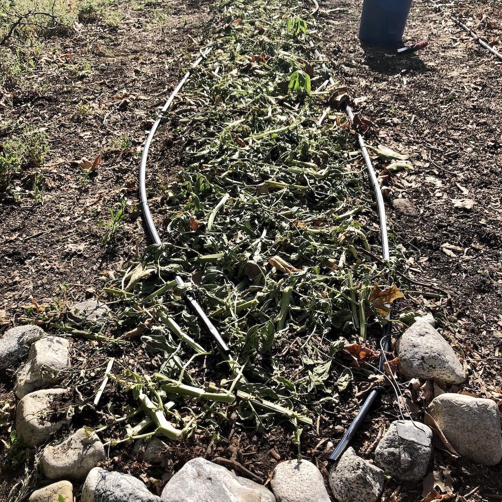 In addition to the favas that we planted to harvest, we also grew a few rows of favas as a cover crop. Favas and others in the legume family have a symbiotic relationship with Rhizobium bacteria that allows for nitrogen to be fixed from the atmosphere into the soil. When a legume is growing and its corresponding rhizobia is present, the bacteria will colonize the roots and form nodules or clusters of nodules which become the site for fixing atmospheric nitrogen (fun fact: the nodules can turn pink from leghemoglobin, same stuff makes the Impossible Burger “bleed”). To ensure that the proper rhizobia are present when growing our favas, we use an inoculant when sowing the seeds. Before our cover crop of favas puts energy into growing the beans, we chop them, cut them into approximately 6” pieces, and spread them across the bed to decompose into the soil as a green manure. As the chopped plants break down, they act as a weed barrier and they help retain soil moisture. These cover crops are a great way to feed the soil from which we constantly extract energy and nutrients!