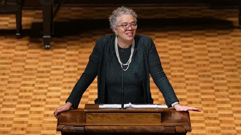 At the beginning of her address, Starr called the College—founded in 1887 in a town with no paved streets—an extraordinary place “that’s constantly reinventing itself yet is also really proud of the traditions and the places from which we have individually and collectively come.”
