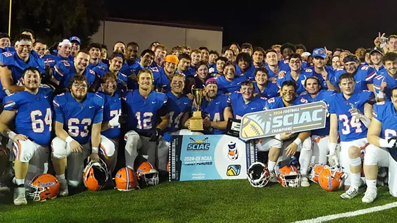 Pomona-Pitzer football team is all smiles after capturing the 2024 SCIAC Championship.