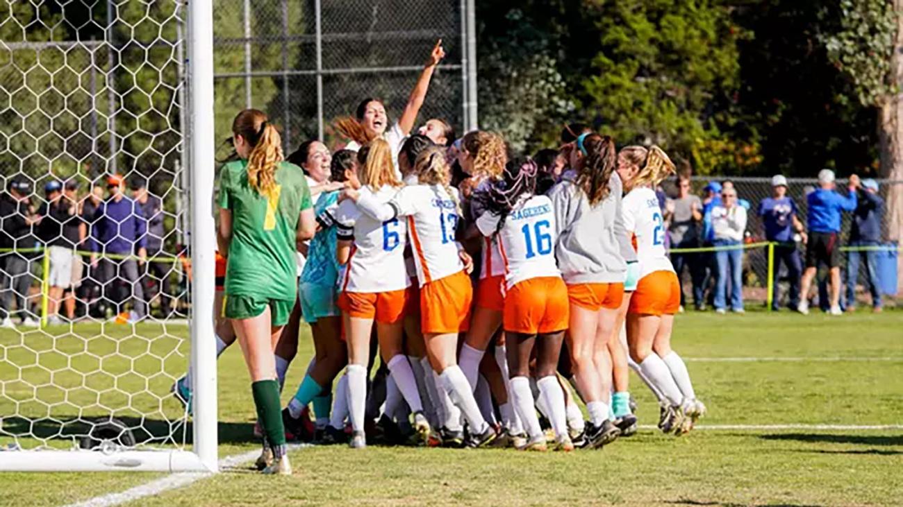 Pomona-Pitzer women's soccer team celebrates their victory in the NCAA match-up against UC Santa Cruz.