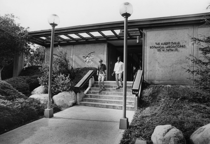 The 12,261-square-foot building housed classrooms, seminar rooms, labs and offices, all of which opened onto an interior greenhouse-atrium, covered by a lath roof, and including a stream with fish and frogs, pools, and, in the center, a redwood tree planted by Edwin Phillips and botanist Lyman Benson. Two “phytotrons”—laboratories comprising a series of chambers in which light, temperature, and humidity could be controlled—permitted experimental work on the effects of environmental change on plant life; three “wet labs” served physiology-ecology, general botany, and bio-chemistry and micro techniques. The complex also contained a taxonomy laboratory with a “working herbarium” containing 300,000 dried plant specimens and considered one of the most important in the American west; the herbarium, like the library, was jointly administered by Rancho Santa Ana Botanic Gardens. The Thille Botany Building received an award of merit from the Pasadena chapter of the American Institute of Architects in 1977.